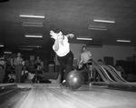 Miss Bill Pulliam is competing in the Women's City Bowling Tournament in Fort Worth, Texas. She is shown following through after rolling her ball down the lane. Miss Pulliam went on to win the all-events championship with a score of 1746. She is wearing a short-sleeve collared blouse and trousers. In addition to bowling, Miss Pulliam is a softball player for the city.