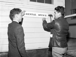 Rosemont Park Veteran Housing Project is helping house former soldiers and their families. Hanging a sign, left to right, are Johnny Grammer and M. V. Carlton. Mr. Grammer is the resident supervisor of the project. He is dressed in a suit. Mr. Carlton is the maintenance superintendent for the Fort Worth Housing Authority. He is nailing an identification sign on the rental office. He is wearing a leather coat and trousers. The housing project was converted from the mess halls at Camp Barkeley. The structure is divided to house four families.