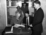 The Junior Chamber of Commerce has set up a poll tax booth in a house trailer at the corner of 7th and Main Street. Fletcher Ward (left) is writing out a receipt for H. T. Stedman. Waiting to pay is W. R. Rucker. Standing in the background, left to right, are James W. Pritchard, who donated the trailer, and Lucian Willoughby. All five men are dressed in suits.