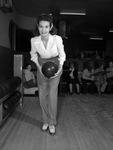 Marifrances Kelley is competing in the Women's City Bowling Tournament in Fort Worth, Texas. She averaged 174 from scratch, 30 pins over her previous average, but missed the singles championship by one point. She is shown holding a bowling ball prior to her turn. She is wearing a button-up blouse and checkered trousers.