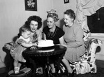 Patricia Starr is celebrating her first birthday. She is shown poking a finger into the icing of her cake. Celebrating with Patricia, left to right, are her mother Mrs. Pat Starr, grandmother Mrs. Porter McAfee, and great-grandmother Mrs. J. S. Pool. They are shown sitting on a floral couch. The cake is being displayed on the coffee table.
