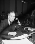 E. B. Sisserson has been named manager of the local America Red Cross chapter. He is shown receiving phone calls congratulating him on the promotion, effective February 1, 1947. Mr. Sisserson has called Fort Worth, Texas, home for the last 20 years. He is sitting at his desk, dressed in a three-piece suit.