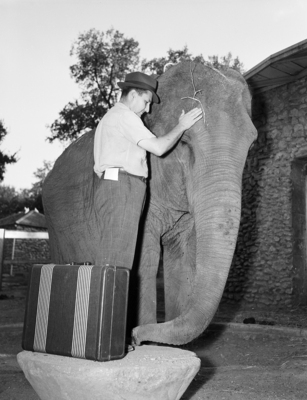 Image shows Hamilton Hittson, with luggage, saying his goodbyes to Queen Tut, Elephant at the Forest Park Zoo. The zookeeper is leaving to the East to get a companion for the Elephant. Published in the Fort Worth Star-Telegram morning edition October 10, 1940.