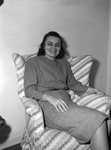 Miss Jane Hodges is visiting from Chicago, Illinois. She is the house guest of Mrs. Claude D. Dickerson in Fort Worth, Texas. Miss Hodges is shown sitting on a polka-dot armchair. She is wearing a long-sleeve dress with a houndstooth pattern.