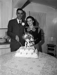 Newlyweds Charles and Madeleine Mandin Allard are enjoying their second marriage ceremony in as many weeks. The ceremony is being held at the home of the groom's sister, Mrs. C. W. Dutton. The newlyweds are shown cutting into their wedding cake. Mr. Allard is dressed in a three-piece suit with a carnation boutonniere. Mrs. Allard is a French war bride. She is wearing long-sleeve blouse, skirt, necklace, and a cameo brooch.