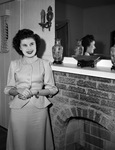 Miss Nita Gene Taylor married Benny Graham Clark in Fort Worth, Texas, on January 10, 1947. Mrs. Clark is the daughter of Mr. and Mrs. Woodie Taylor. She is a former student at North Texas Agricultural College (N. T. A. C.). Mrs. Clark is shown standing beside the fireplace at her parent's home. She is wearing a button-up blouse and a skirt.