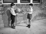 The March of Dimes is raising funds and awareness for polio patient care. Playing catch on the street, left to right, are neighbors Brent Berryman and Dick Cantrell. Both boys were diagnosed with infantile paralysis (polio). They have since recovered enough to take part in active sports. Brent is wearing a button-up shirt and cuffed jeans. Dick is dressed in a short-sleeve shirt and shorts.