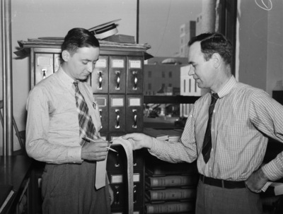 The first absentee voter at the Tarrant County Court House is receiving his ballot. Standing in the County Clerk's office left to right are, Billie Conn, absentee voter, and E. H. Raines. Mr. Conn is wearing a polka-dot dress shirt, necktie and trousers. Mr. Raines is dressed in a gingham button-up shirt, necktie, and trousers. There is a cabinet and a bookshelf in the background.