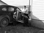 The Rosemont Park Veteran Housing Project is helping house former soldiers and their families. One of the first tenants, the Dickinson family, are shown unloading furniture from their automobile. Carrying a table are Mr. and Mrs. James Dickinson, Joy Dickinson (left), and Genia Dickinson. Mrs. Dickinson is sitting on the passenger side of the car. Mr. Dickinson is a former chaplain in the United States Army. He is dressed in a pinstripe shirt, necktie, and trousers. Joy is wearing her hair in a scarf, a striped shirt, and overalls. Genia is dressed in a sweater and trousers.
