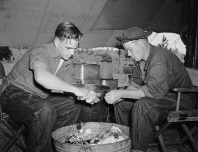 Texas National Guard maneuvers in Louisiana. A tent city was built overnight, appetizing odors arose from cooking quarters and citizen soldiers rolled up their sleeves and went to work on piles of potatoes as 9,500 Texas National Guardsmen reached the site of their three weeks training maneuvers in the Kisatchie National Forest, near Cravens, Louisiana, last weekend. Privates J. M. Ellis, left, and Robert Ross, Service Company One Hundred and Eleventh Medical Corps, pictured at their culinary duties. A scene that any former service man could readily identify as Kitchen Patrol (K. P.) duty.