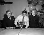 Volunteers with the American Red Cross are making 600 gingham dresses, 250 pairs of shorts, and 250 boys' overalls. Cutting the material, left to right, are Sam Herzfeld, Manfred H. Herzfeld, and Mrs. Sarah Bunch. The Herzfeld Manufacturing Company is lending their cutting machine for the project. Sam Herzfeld is the owner of the company. He is dressed in a dark, double breasted suit. Manfred Herzfeld is giving a demonstration of the cutting machine. He is wearing a dress shirt, necktie, and trousers. Mrs. Bunch is a Red Cross chairman. She is wearing a dark dress. The finished clothes will be sent to Red Cross depots overseas.
