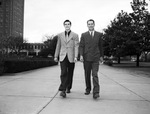 The Texas Wesleyan College (T. W. C.) basketball team is taking every precaution with their new basketball player. Handcuffed together, left to right are Richard Cozad and Coach Johnny Edwards. Texas Christian University recent pilfered a prize basketball player from the Rams. Coach Edwards is guarding against the possibility of losing another player. Cozad is dressed is a collared shirt, necktie, striped trousers, and a sports coat. Coach Edwards is wearing a double breasted suit.
