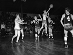 The first round of the high school basketball 7-AA Championship is being played at Will Rogers Memorial Coliseum. Competing in the game are the Paschal Panthers and the Polytechnic Parrots (white jerseys). Parrot center Luther Scarborough (47) is shown leaping into the air, attempting to score two points. Closely defending the shot are Bill Putnam (13) and Bryan Kirkpatrick (8). Eldon Conrad is standing in the foreground (4). Scarborough missed the basket and the Panthers went on to win the game 37-22.