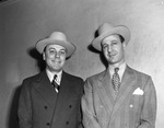 Two men are visiting Fort Worth, Texas from out of town. Pictured left to right are Edgar W. Percival and Carl Friedlander. Mr. Percival is from New York City, New York. He is dressed in a hat and a double breasted suit. Mr. Friedlander is a native of Cincinnati, Ohio. He is wearing a hat and a double breasted suit with a Glen Check pattern.