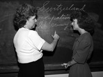 Standing in front of a chalkboard, left to right, are Mrs. Ruby West and Bobbie Dean McGregor. Bobbie Dean, 14, is returning to school after beating what specialists called an "incurable" heart disease. She is the daughter of Mr. and Mrs. W. C. McGregor. Mrs. West is a teacher at Carroll Peak Elementary School. She is reviewing the class study. She is dressed in a blouse and a skirt. Bobbie Dean is wearing a dress with a bow tied at the collar.