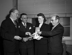 Miss Ima Dene Harrison, March of Dimes Secondary, receiving contributions from fashion exhibitors (from left) John Cully, Allen Kline and Mayor Kahn.