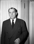 R. Conroy Scoggins is the state deputy of the Knights of Columbus. He is the guest speaker at a dinner honoring William J. Shaw, the oldest active member in Fort Worth, Texas. Mr. Scoggins is a native of Houston, Texas. He is shown standing in front of a door, dressed in a double-breasted suit.