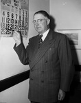 Max Highfill is chairman of the Colonial Club's tournament committee. The second National Invitation golf tournament will be played at the Colonial Country Club from May 15-18, 1947. Mr. Highfill is indicating the dates on a calendar. He is dressed in a double-breasted suit. The tournament purse is $15,000. The winner will receive $3,000.