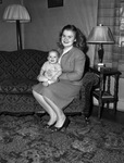 Mrs. F. E. Bryson and her young son, Michael Bryson, are visiting Fort Worth, Texas, from Baton Rouge, Louisiana. They are staying with her parents, Mr. and Mrs. W. B. Hatch. Mrs. Bryson is wearing a blouse, blazer, and a pleated skirt. Michael is sitting on his mother's lap, dressed in a onesie.