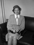 Miss Elizabeth Allen, of Dallas, Texas, a key witness for the defense in the Cole Murder Trial. The trial is beginning Monday morning with the selection of the jury. Mrs. Alice Cole has been charged in the October 7th murder of her estranged husband, James Cole. Miss Allen is shown sitting on a couch. She is wearing a hat, button-up blouse, and a skirt. According to the defense attorney, Miss Allen was the "other woman."