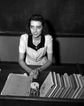 Miss Maxine McDonnell is beginning teaching duties at Denver Avenue Elementary School. She is teaching a second grade class. Miss McDonnell attended Denver Avenue when she was in elementary school. Her second grade class was in the same room where she is now teaching. Miss McDonnell is shown sitting at her desk. There is a chalkboard behind her. She is wearing a button-up dress. On her desk are several books.