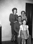 A brother and sister are being reunited in Fort Worth, Texas, after a separation of 30 years. Mrs. Lula Koepp (left), of Fort Worth, Texas, is hosting her brother, Clinton G. Allen, along with his wife and daughter. The Allens are visiting from Burlington, New Jersey. Mrs. Koepp is wearing a hat, blouse, blazer, and a skirt. Mr. Allen is dressed in a pinstripe suit. Mrs. Allen is wearing a dress and her daughter is wearing a short-sleeve blouse, a pinafore dress and a pearl necklace. The four family members are posed in front of a blank wall; Mr. Allen is seated while his daughter stands in front of him and his sister and wife are standing behind him.