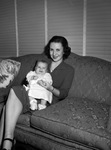 Mrs. Nancy Ruth Sherman is visiting Fort Worth, Texas, with her son, Clayton Collier Sherman. Mrs. Sherman, formerly Miss Collier, is visiting her mother, Mrs. W. V. Ellzey. Mrs. Sherman and her husband, Winthrop Sherman, live in Washington, D. C. She is wearing a collared dress and a pearl necklace. Clayton, three-months old, is sitting on his mother's lap, dressed in a nightgown.