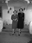 Mrs. Charles F. A. McCluer, left, and Mrs. F. J. Keller are preparing for their upcoming vacation. The women will travel to New York and from there they will sail to Bermuda. They are shown standing on Mrs. McCluer's front porch. Mrs. McCluer is dressed in a blazer and a skirt. Mrs. Keller is wearing a dark dress.