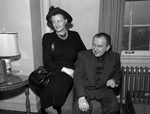 Mr. and Mrs. Fritz Reiner are in Fort Worth, Texas, with the Pittsburgh Symphony. Mr. Reiner is the conductor of the symphony. They are making their first Texas appearance at the Will Rogers Memorial Coliseum. Mrs. Reiner sitting on the arm of a chair, wearing a hat, dark dress, and a pearl necklace. Mr. Reiner is dressed in a dark, three-piece suit.