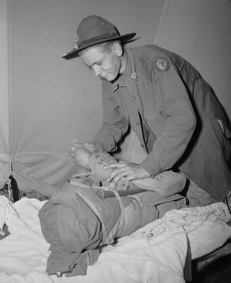 Texas National Guard maneuvers in Louisiana. It was a hot ride from Fort Worth, so Private John W. Ball of the medical regiment pulls out his canteen first as he opens his pack after arrival at the encampment grounds. Having plenty of pure water at hand is the prime consideration of all the guardsmen.