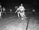 A high school basketball game between the Abilene Eagles and the Bowie Jackrabbits (white jerseys) is being held in Fort Worth, Texas Tuesday night. Lanky Jackrabbit, Cliff Wall (87) is shown dribbling away from the sideline. He is being pursued by number 8 with the Eagles. The Abilene Eagles railed to win the game 31-25.