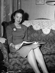 Mr. and Mrs. Charles A. White Junior recently moved to Fort Worth, Texas, from San Antonio, Texas. They are temporarily staying with Mrs. White's parents, Mr. and Mrs. Lee R. Sumpter. Mrs. White is shown sitting on a couch, reading a newspaper. She is wearing a striped dress with buttons down the side.