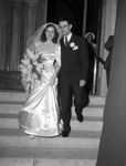 Miss Lola Katheryne Thompson and Mr. William Clinton Bahan are being married, noon Thursday at Saint Patrick's Catholic Church. Mr. and Mrs. Bahan are shown leaving the Church shortly after their wedding. Mrs. Bahan is wearing a an all-white faille gown with a lace Dutch cap. Mr. Bahan is dressed in a double breasted suit with a flower in the lapel. The couple is planning to live in Urbana, Illinois, where Mr. Bahan will attend the University of Illinois.