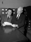 The Carter Bible Class of Fort Worth's First Christian Church is electing a new president. Pictured left to right, are S. C. Farrar and Reverend L. D. Anderson. They are discussing class business. Mr. Farrar is the new president. He is wearing a double breasted, pinstripe suit. Reverend Anderson is a teacher. He is dressed in a double breasted suit.