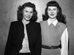 Two students from the University of Texas are spending the holidays in Fort Worth, Texas. Standing against a wall, left to right, are Miss Dell Harp and Joan Sonricker. Miss Harp, of Corsicana, Texas, was named one of the ten most beautiful girls at the University. She is wearing a sweater and a dark blazer. Miss Sonricker, of Smithfield, Texas, is the daughter of Mr. and Mrs. W. R. Sonricker. She is wearing a collared blouse, sweater, and a belt around her waist. The girls will soon return to classes in Austin, Texas.