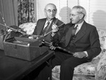 Two brothers, and veterans of the railroad, are preparing to retire. Sitting on a couch, left to right, are H. H. Tittle and K. S. Tittle. Between them, the brothers have totaled ninety-nine years of service with the railroad. They are both looking forward to retirement and spending time fishing on the lake. H. H. is dressed in a pinstripe suit. K. S. is wearing a three-piece suit. They are shown sorting through a tackle box and examining various lures.