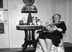 Mrs. L. G. Stogner is president of the Penelope Club. In December of 1945, Mrs. Stogner prepared a speech on "The American Home", which she presented to the Fort Worth Federation of Women's Clubs. Since the initial presentation, she has given the speech nineteen times to various organizations. Mrs. Stogner was raised in Plainview, Texas, after her family moved from Mississippi in the 1890's. She is the youngest of five children and was named Lacy Dalton, after her father Lacy W. Dalton. Mrs. Stogner has been married twenty-seven years to an independent oil operator. She is shown sitting on a chair, reading a magazine. She is wearing a dark dress.