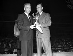 Golden Gloves boxer Tom Prouse (left) receiving the Texas Christian University (T. C. U.) trophy from Dan Coates.