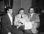 Barbed Wire Vets. Left to right, A. Philo Howard Jr., Houston; Harry Harvey, Goose Creek, and Amon Carter Jr. The men are looking over a document held by Mr. Harvey with a list of former war prisoners living in Texas. The men are seated on a chair and are dressed in suit and ties. Mr. Harvey and Mr. Carter have their legs crossed.