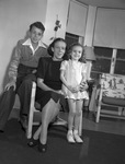 Mrs. R. K. Ransone is sitting on a chair and posing with her children, left to right, Robin and Sally Baird. Robin is dressed in a collared shirt, corduroy jacket, and trousers. Mrs. Ransone is wearing a dark dress. Sally Baird is wearing a button-up dress.
