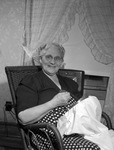 Mrs. J. H. McKinney is being honored during Tom Breneman's radio program, "Breakfast in Hollywood". She will be saluted as a "good neighbor" for her volunteer work at St. Joseph's Hospital. She is shown relaxing on a wicker chair as works on her embroidery. Mrs. McKinney is wearing a dark blouse and a polka-dot skirt.