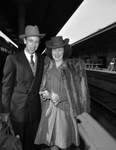 Mr. and Mrs. Eurie Miller Junior are being reunited at the Texas and Pacific Railway Station in Fort Worth, Texas. Mr. Miller is picking up his wife, a British war bride, who is arriving from London, England. Christmas at the Miller home was postponed as the awaited Mrs. Miller's arrival. Mr. Miller is dressed in a hat and a three-piece, double breasted suit. Mrs. Miller is wearing a hat, striped coat, and a fur shawl.