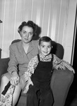 Mrs. R. E. Stanfield and her seven-year old son, Scott, are traveling to Fort Worth, Texas for the first time. They are shown visiting the home of her sister, Mrs. W. D. Marrs. Mrs. Stanfield and Scott live in Hutchinson, Kansas. Mrs. Stanfield is wearing a button-up blouse and a skirt. Scott is dressed in a plaid shirt and overalls.