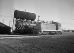 The Missouri-Kansas-Texas Railroad Company is replacing the old 100-class steam switching engine with a diesel engine. Both the old and new engines are shown in the train yard. The diesel switcher is the first of five that will be replacing the old models as the Fort Worth yard operation goes completely diesel.
