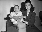 The Reynolds Family recently moved to Fort Worth, Texas from Colorado City, Texas. Pictured in their new home are Mrs. Glenn H. Reynolds and her son, John Nichols. Mrs. Reynolds is the former Miss Jean Nichols. She is wearing a button-up blouse and a skirt. The baby is the namesake of her brother, Lieutenant John Nichols of the United States Navy. John Nichols, eight-months, is sitting on the arm of the couch. He is wearing a knit sweater and trousers.
