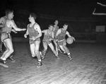 The Texas Wesleyan Rams (striped jerseys) are hosting the visiting Howard Payne Yellow Jackets. The college basketball game is being played at Will Rogers Memorial Coliseum in Fort Worth, Texas. Ram, Ted Nicksick (50) is leading the way as Clifton McNeeley (22) drives to the basket. In pursuit for the Yellow Jackets are Bob Clindaniel (17), D. C. Hargrove (22), and Herman Moore (44). The Rams went on to win the contest 61-52.