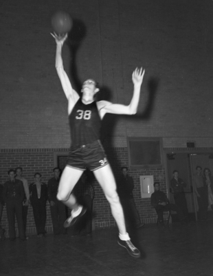 Image shows Edgar West is one of the stars of the Polytechnic High School basketball team. He has helped push the Parrots to six straight victories, including a 33-8 win over Arlington Heights. West, number 38, is catching a high pass from a teammate in the gymnasium. A line of students are behind him, watching the action. Published in the Fort Worth Star-Telegram evening edition January 10, 1940.