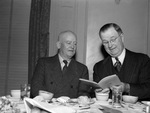 Fort Worth's Community Chest is holding their annual dinner meeting, Wednesday night. In attendance, left to right, are Joe C. Stephens and C. W. Wofford. Mr. Stephens is one of the organizers of the Community Chest. He is dressed in a double breasted suit. Mr. Wofford is president of the organization. He is wearing a three-piece pinstripe suit.