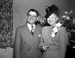Mrs. Geneva Chandler married Mr. S. L. Wyse Wednesday, February 5, 1947. The ceremony was held at the home of Mrs. R. E. Winger. The couple will spend their honeymoon in New Orleans, Louisiana. Mr. Wyse is wearing a double breasted suit with a pocket square. Mrs. Wyse is wearing a hat, striped button-up dress, and a corsage.