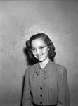 Virginia Sue Cain is the newest member of the Order of the Teenagers. She is the thirteen year old daughter of Mr. and Mrs. Ira Cain Junior. Virginia Sue celebrated her birthday with dinner and a show at the Texas Christian University Theater. She is shown standing against a wall, wearing a striped button-up dress.